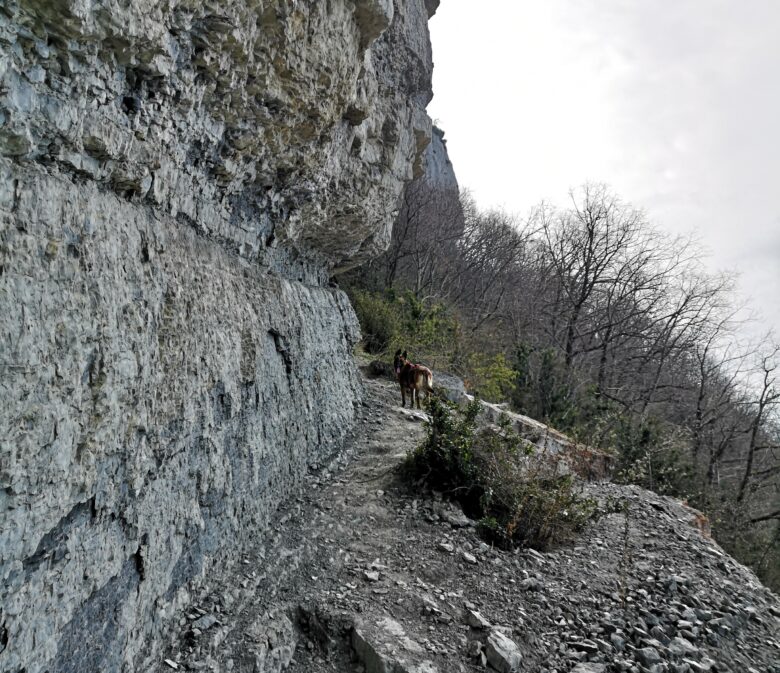 Cela nous permet de retrouver un sentier digne de ce nom et on arrive enfin sur un panneau d’indication Trou de Chignin 980m où il faut continuer tout droit. On arrive très rapidement à l’échelle après avoir longé une falaise rocheuse et tourné à gauche pour trouver celle-ci.