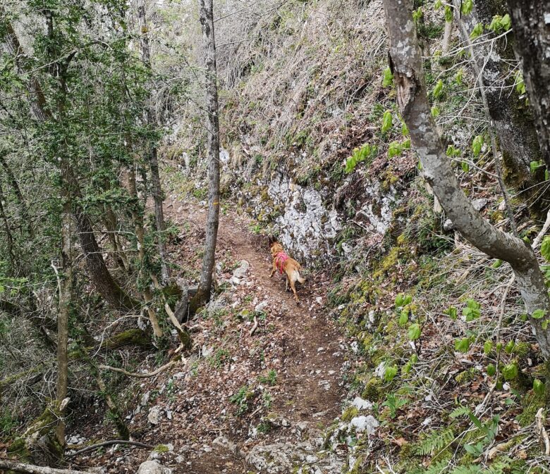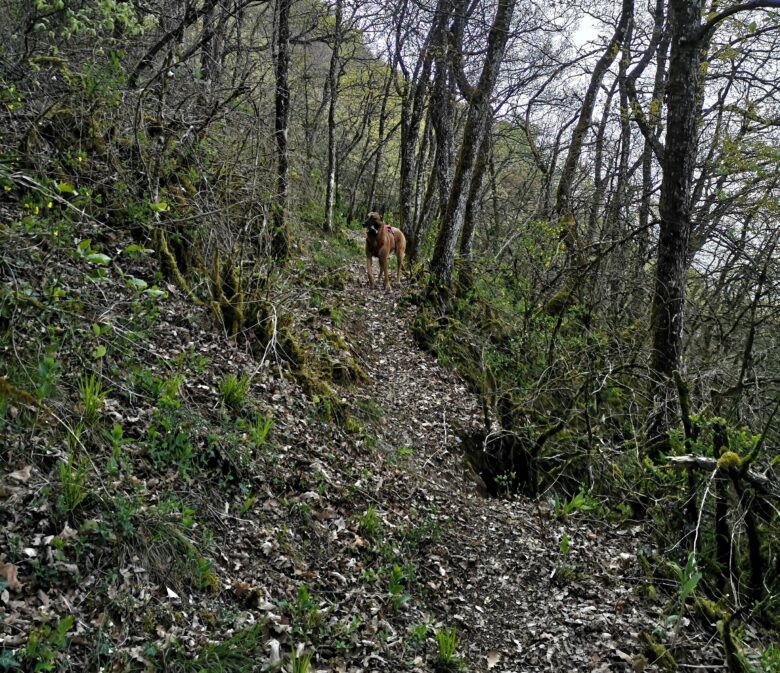 Après le franchissement d’une clôture de trois fils, le sentier monte en diagonal. Allez savoir comment, on était censé tomber sur un passage cordé, nous aurons donc un petit pont, impossible de savoir si c’était bien la direction voulue par le topo d’altituderando que nous suivions. Toujours est-il que suivant le scotch orange, nous tomberons sur des points bleus que nous suivrons également.