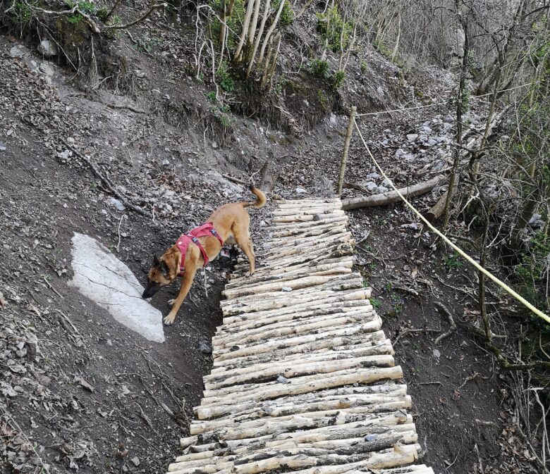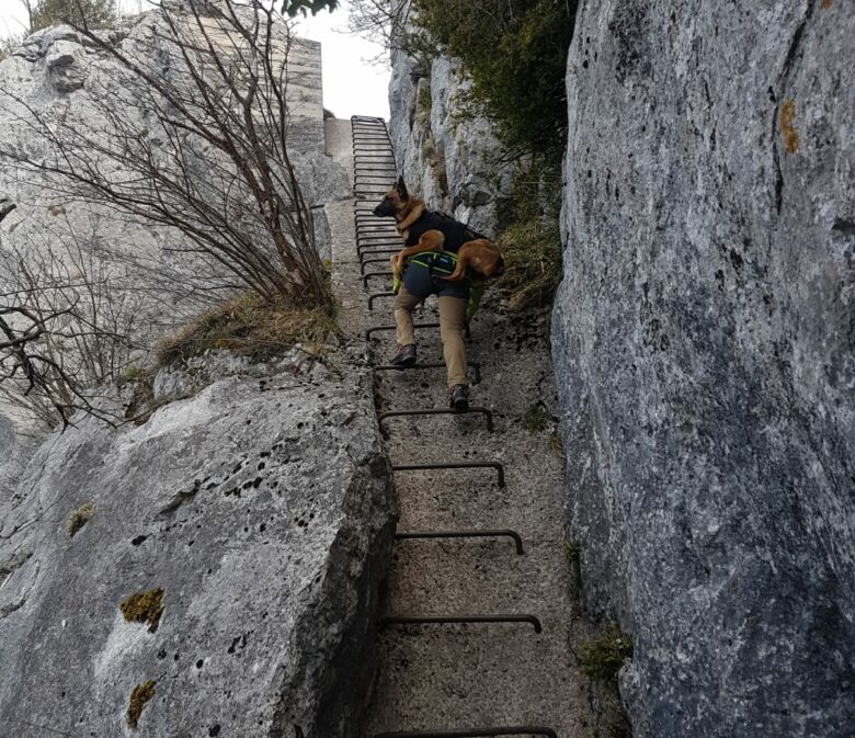 L’échelle est longue d’environ 15 mètres, les barreaux espacés et après quelques pas, il y a un joli vide de 30 mètres sur notre gauche. Cela implique un portage obligatoire pour un chien avec matériel spécifique, ici un harnais d’hélitreuillage Julius et une capacité physique suffisante pour assurer la montée dans ces conditions.
