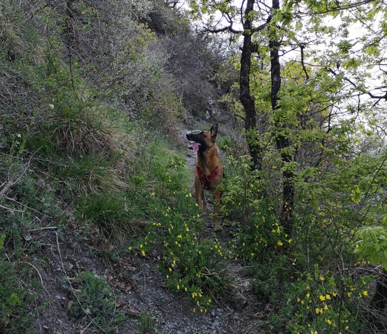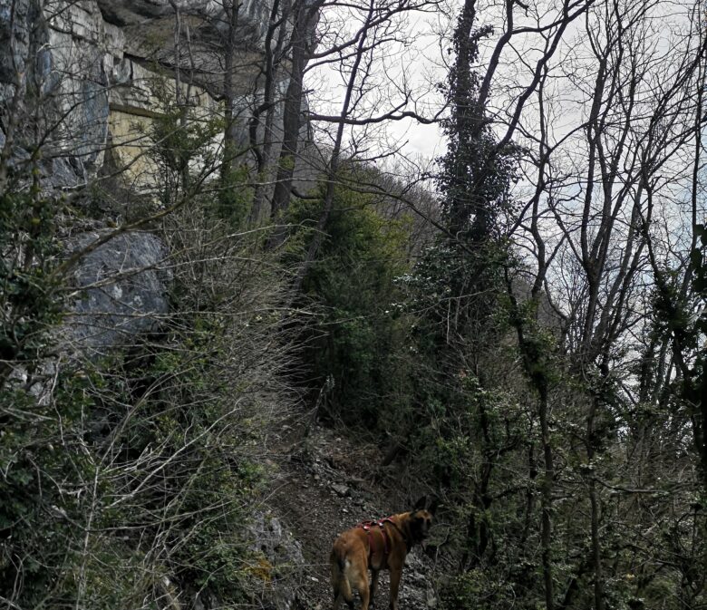 Le retour s’effectue en boucle en revenant sur nos pas au niveau du panneau “Sous le roc de Tormery 1110m” puis en prenant à droite par les Combes Sud en direction du Trou de Chignin. Cela permet d’éviter l’échelle, il est donc possible d’effectuer cette randonnée en aller retour par ce sentier et d’éviter le massage difficile avec un chien.
