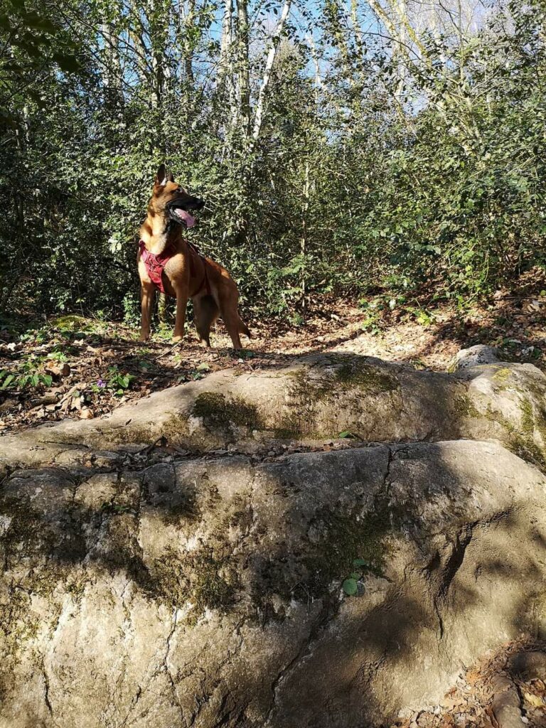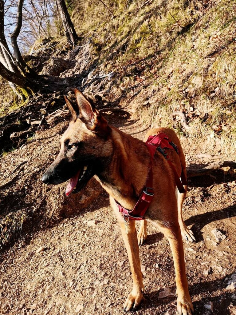 Nous ferons les deux, en s’orientant d’abord en direction de la Dent et ses 4 échelles à franchir. C’est là que les choses se compliquent : un chien aguerri peut vraisemblablement passer toutes les échelles par les côtés sur la roche. Mais la descente peut être dangereuse et votre chien peut se faire très mal. De notre côté, on a fait le choix de prendre du matériel avec le harnais d’hélitreuillage Julius – voir la rubrique matériel spécifique – pour monter Helly en toute sécurité. Nous attirons votre attention sur la nécessaire capacité physique à avoir pour porter le poids de votre chien, celui du harnais et le vôtre sur des échelles.