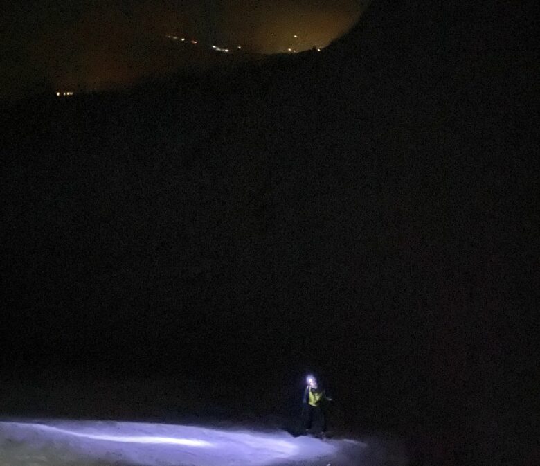 On conseille vivement de veiller à effectuer cette traversée dans le cirque en plein jour. Cela vous permettra de vous orienter au mieux sur le chalet du Rif Premier qui est bien matérialisé sur les cartes. De nuit, nous avons du tâtonner en suivant une trace GPX d’une personne qui nous emmenait continuellement sur des falaises, probablement parce que le relief hivernal a été modifié depuis son passage. Nous avons fait le choix – enfin on a surtout fait comme on a pu, parce que pour la petite histoire, en plus d’un vent à décorner un boeuf, la lampe frontale de ma camarade de cordée a lâchée et on avait pas l’air fine ! – d’arriver par le haut du chalet du Rif Premier et non par le bas comme il en est de coutume.