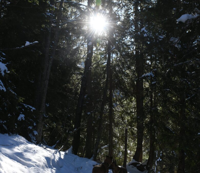 On poursuit sur la route carrossable en raquettes en dépassant les Granges de la Frasse avant de poursuivre et trouver à droite un sentier qui remonte dans la forêt – ce qui permet de couper la route -. Au milieu de ce bout de sentier, on sort de la réserve naturelle et donc il n’y a plus d’obligation de tenir les chiens en laisse.