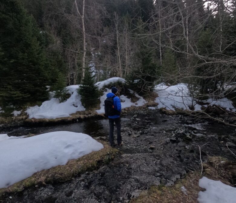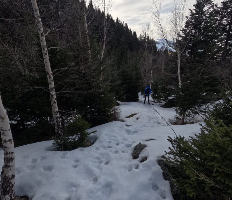 En raquettes, il faut reprendre le même itinéraire qu’à l’aller ! En période estivale, vous trouverez pile en face de vous un sentier non balisé mais assez distinct qui descend pour traverser le cours d’eau avant de continuer sa route dans la forêt.