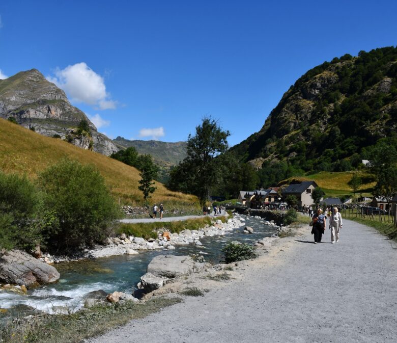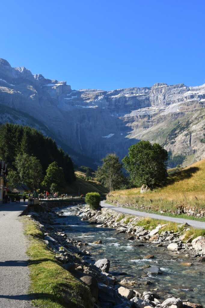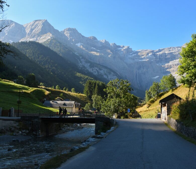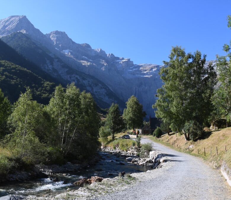 On poursuit le long du canal à droite ou gauche sans importance avant de continuer tout droit sur une longue route carrossable qui remonte jusqu’au Cirque de Gavarnie face à nous que l’on admire tout du long.