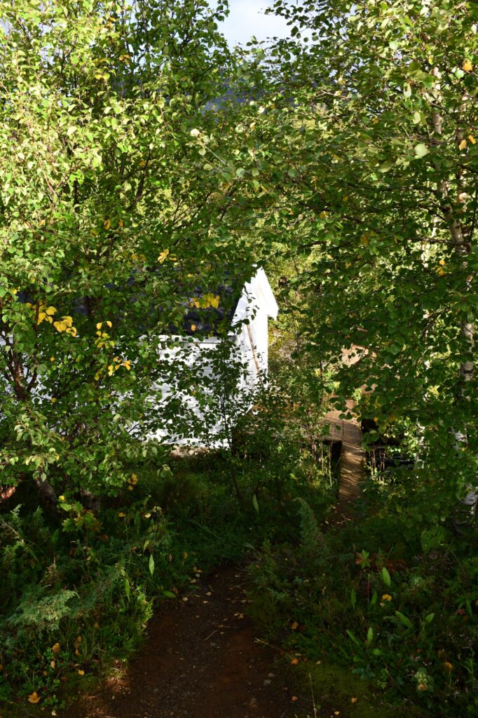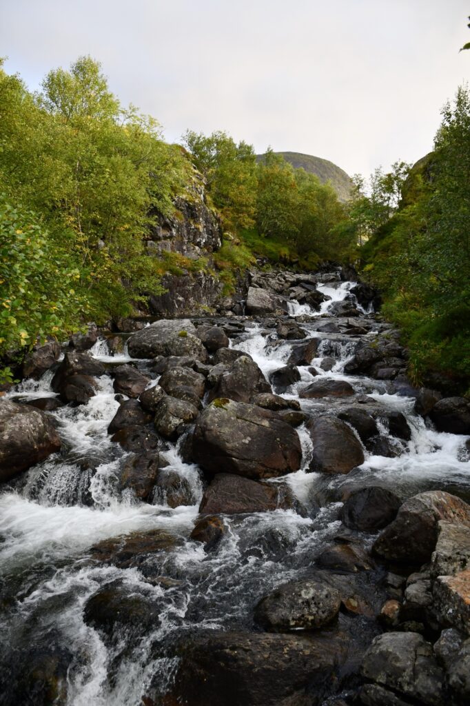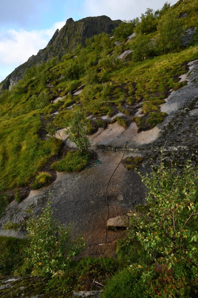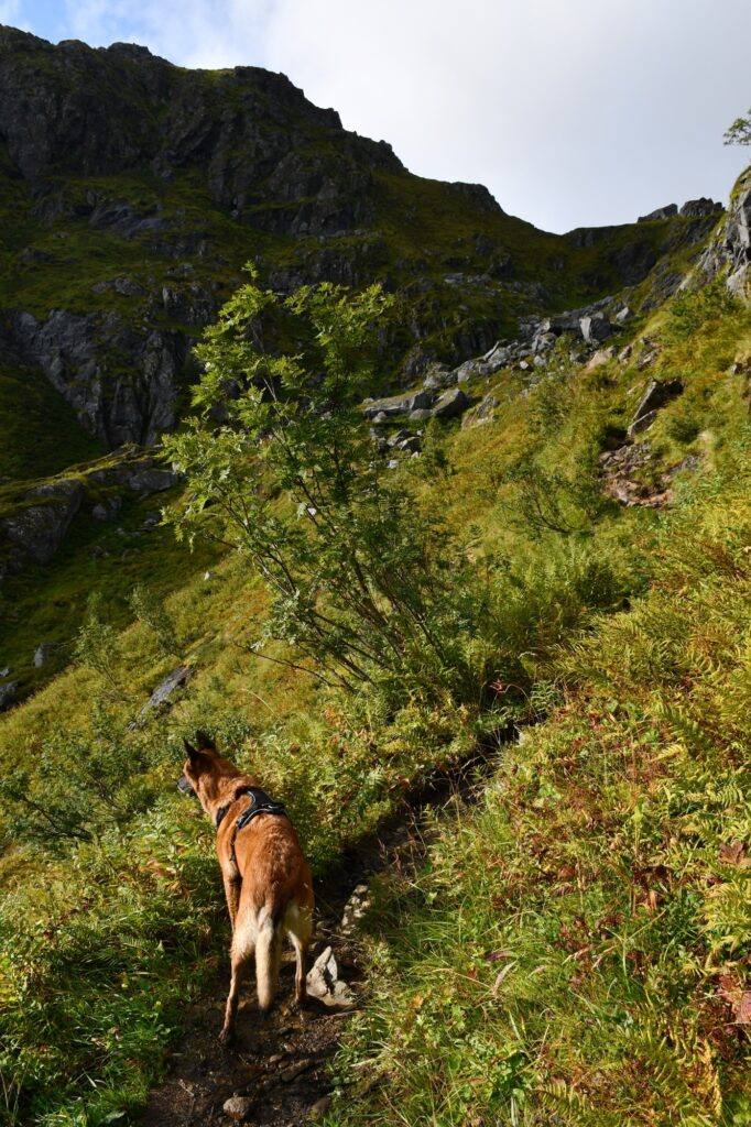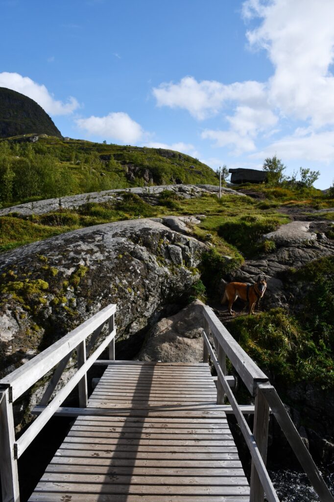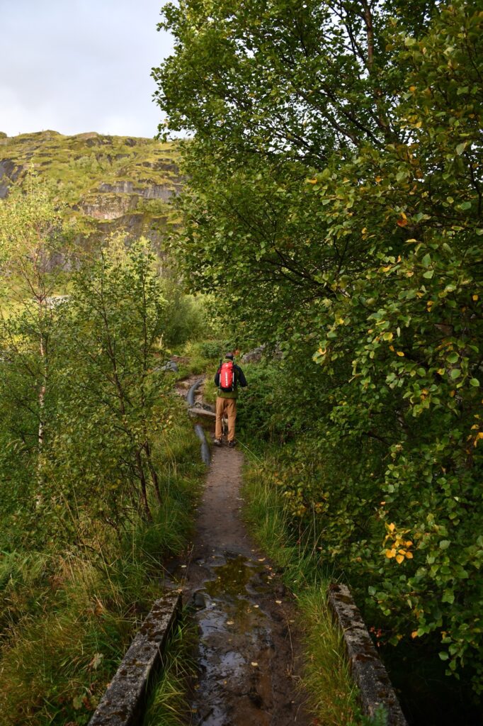 Le début de la randonnée se prend par la route carrossable face à nous et notre premier objectif est de rejoindre le lac de Stuvdalsvatnet soit par un raccourci comme nous l’avons pris par la gauche en empruntant des petits sentiers de traverse en passant à droite des maisonnettes, soit en prenant davantage à droite pour passer au pied de la belle cascade que nous verrons de notre côté au retour.