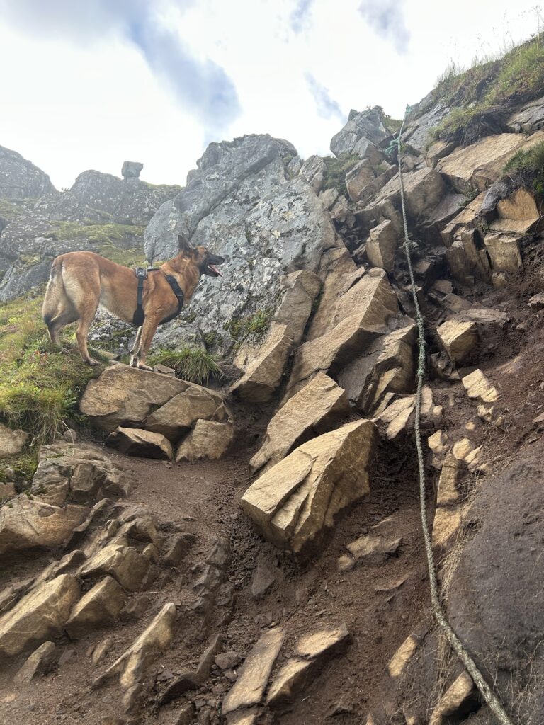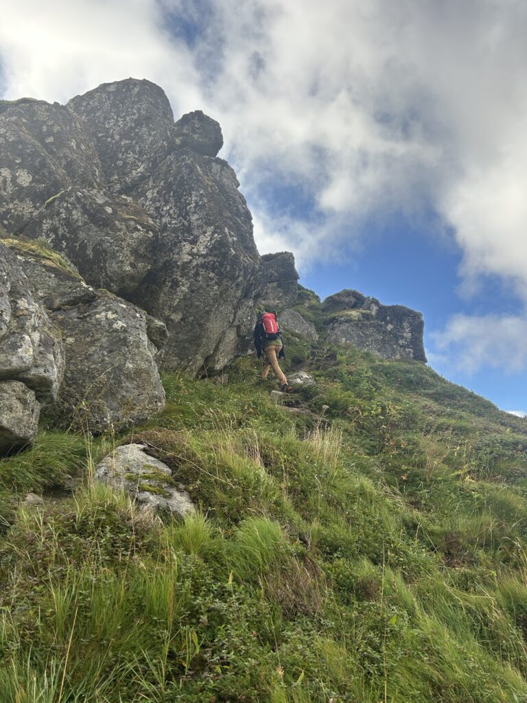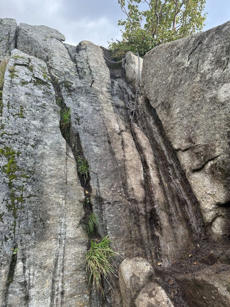En haut, il faut poursuivre à gauche pour débuter la crête. On remonte par le biais d’une main-courante une petite cheminée avant d’essayer de tenir la gauche au maximum – certains sentiers semblent vouloir vous faire monter directement sur le caillou mais c’est inutile -.