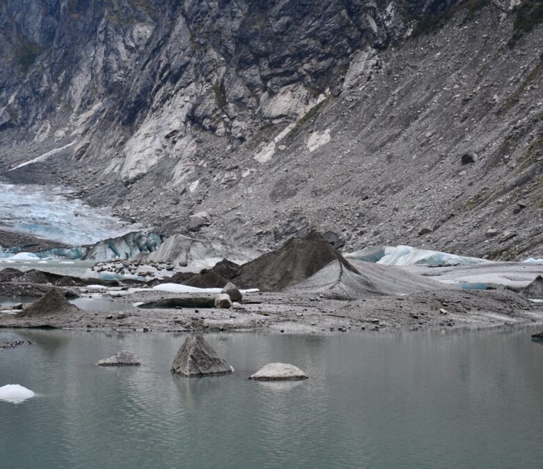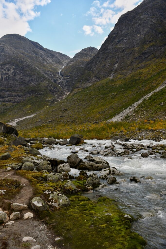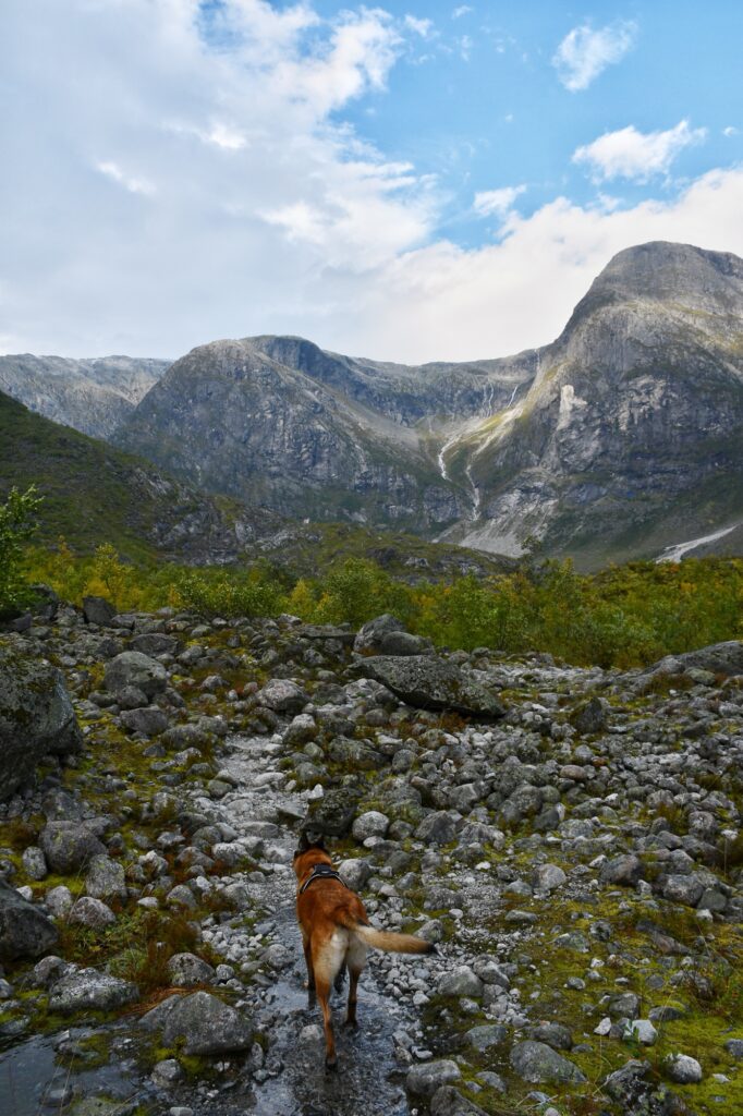 Nous traversons intégralement cette dernière pour s’orienter au fond du vallon. Plusieurs sentiers se mêlent mais tous les chemins mènent au glacier ! Nous prendrons davantage à droite le long du cours d’eau pour contourner le petit dôme au bout.