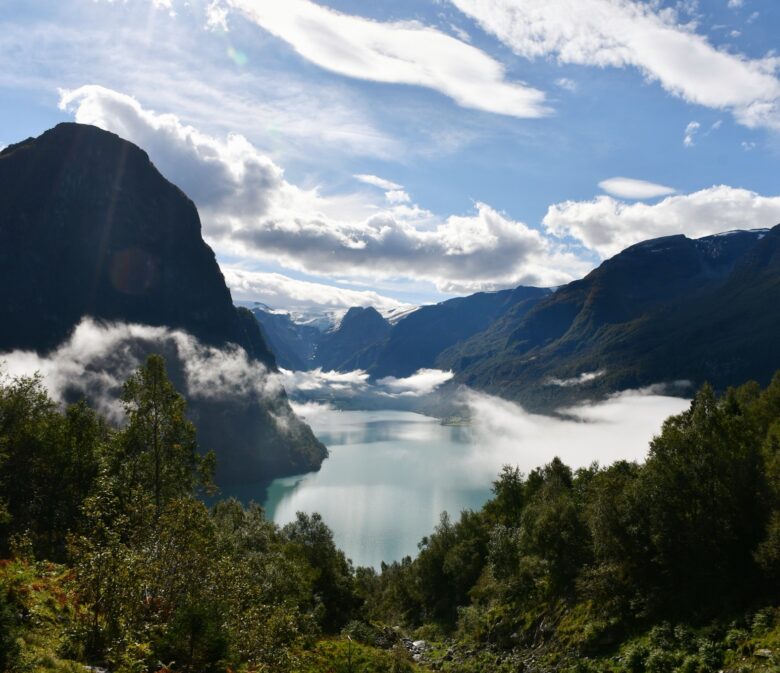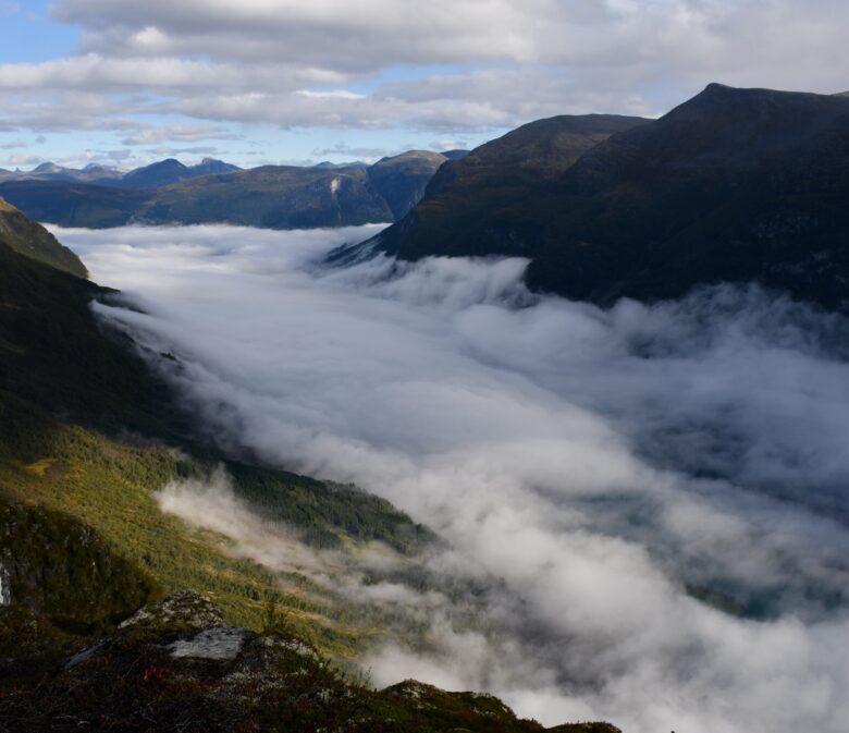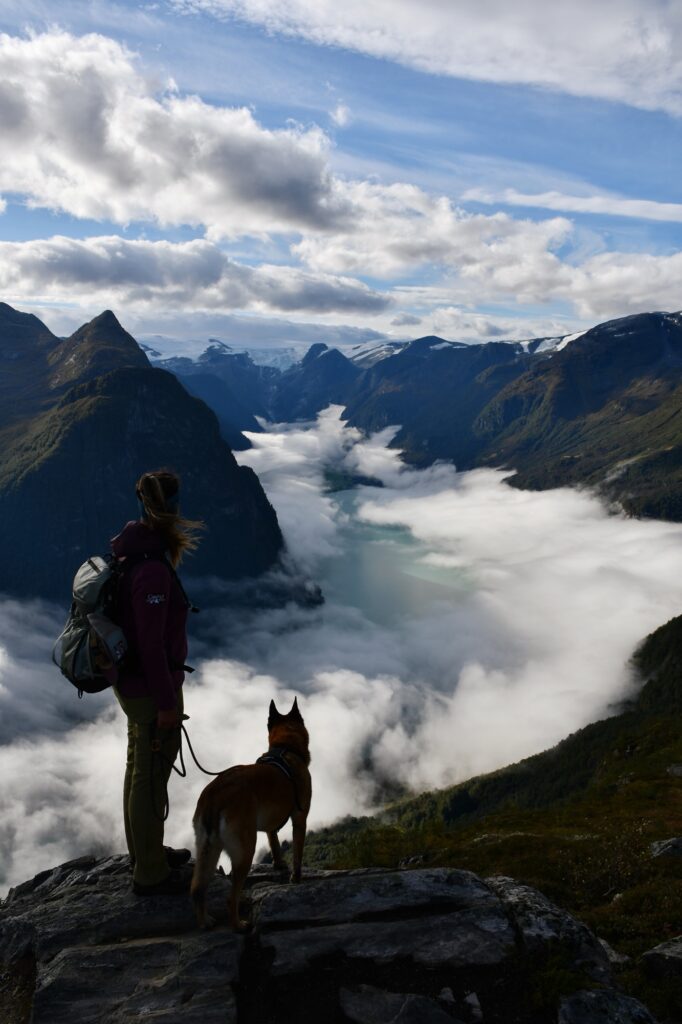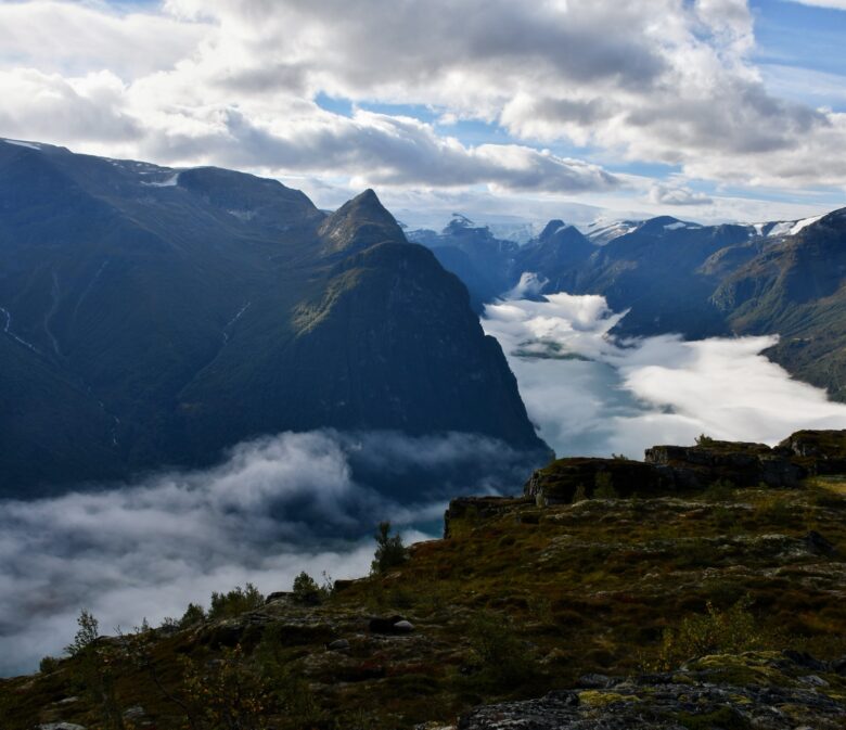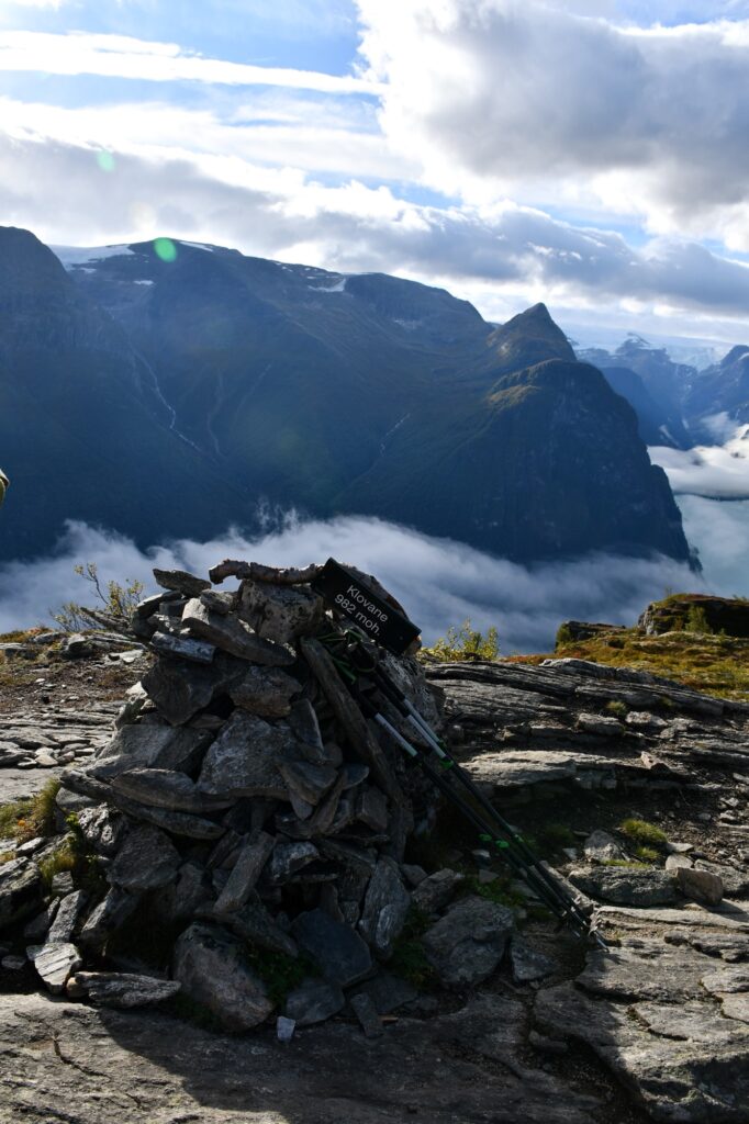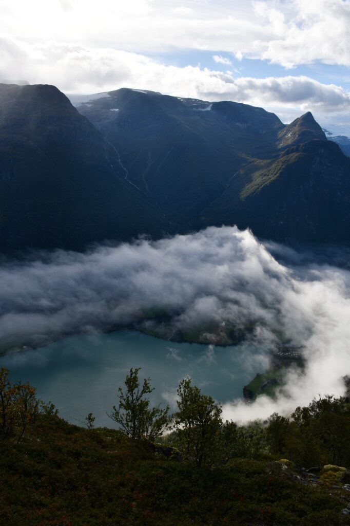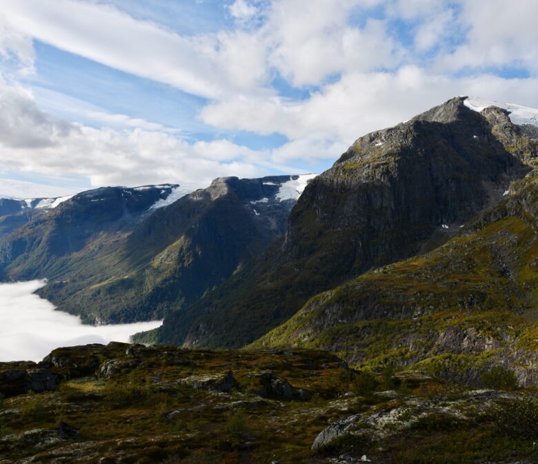 En haut, un plateau nous attend avec le sommet de Klovane qui donne un panorama époustouflant sur le lac d’Oldevatnet et les glaciers aux alentours.