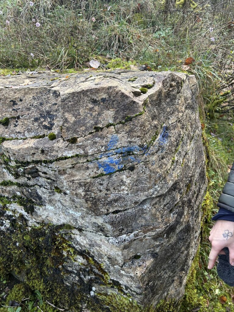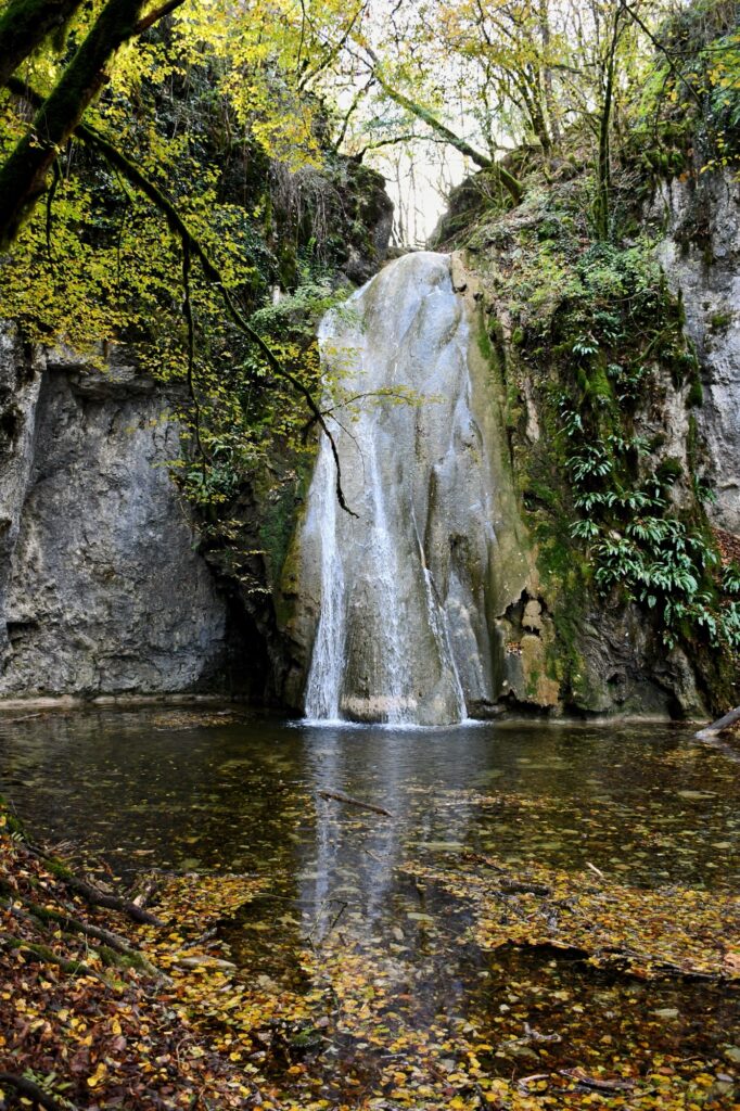 Arrivés au niveau du gros rocher, plusieurs sentiers partent dans tous les sens : il y a deux flèches bleues sur le caillou qui indique les directions possibles qui mènent à la cascade : il suffit de le contourner et de prendre à droite sous ce dernier pour descendre tranquillement au pied de la belle cascade de Verbois.