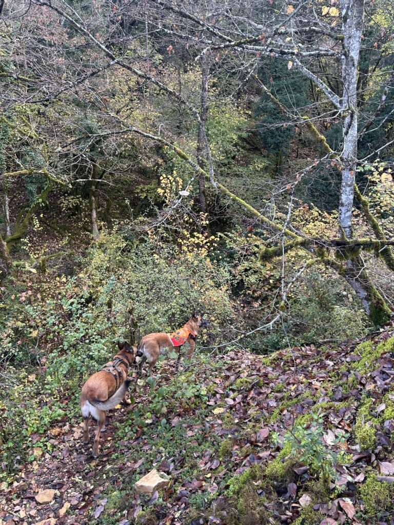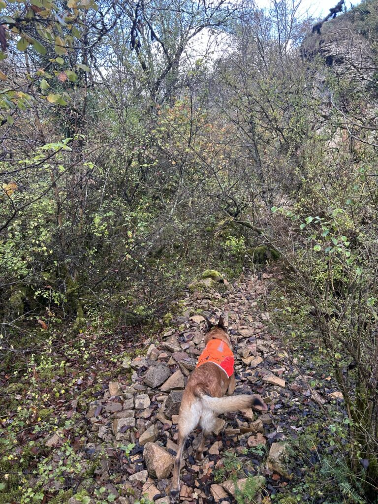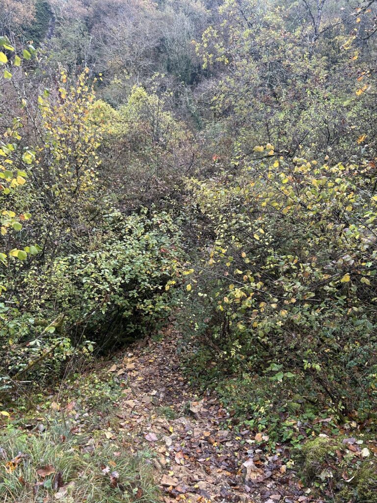 Une première intersection nous fait prendre à droite avant de prendre à gauche à la suivante. Après une petite montée, il s’agit là de ne pas louper le coche : un sentier très discret et non balisé part à gauche et redescend légèrement dans les broussailles.
