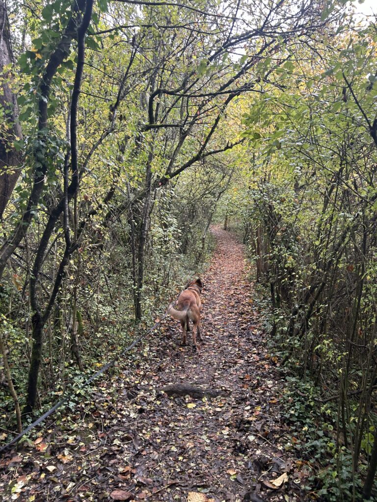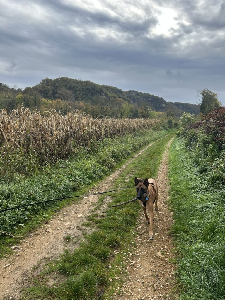 À la patte d’oie du Pont Vieux, on prendra sur la route à droite avant de croiser une route carrossable à droite encore qui longe un champ. Puis cela se resserre en petit sentier forestier progressivement.