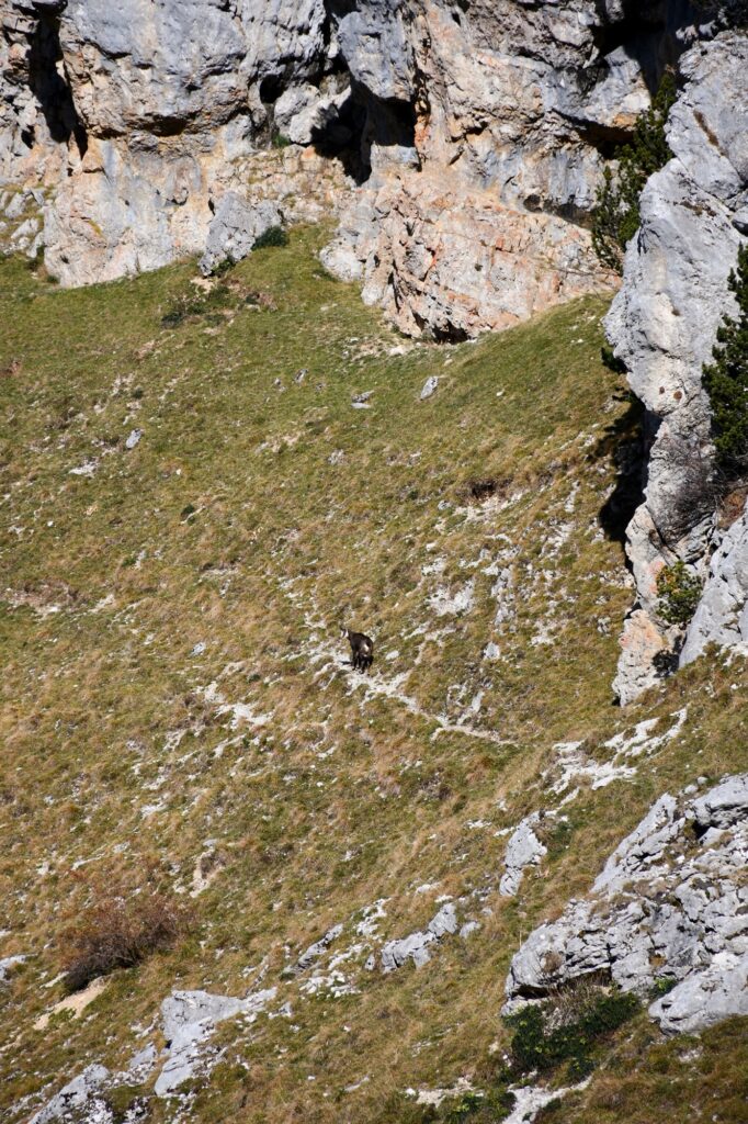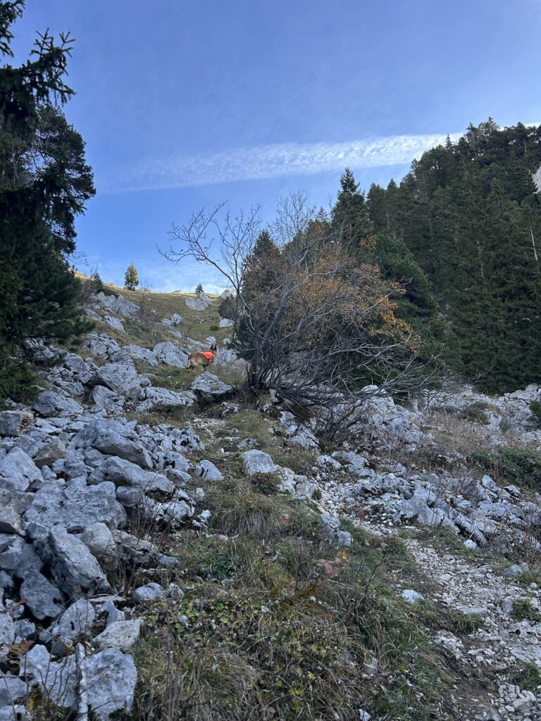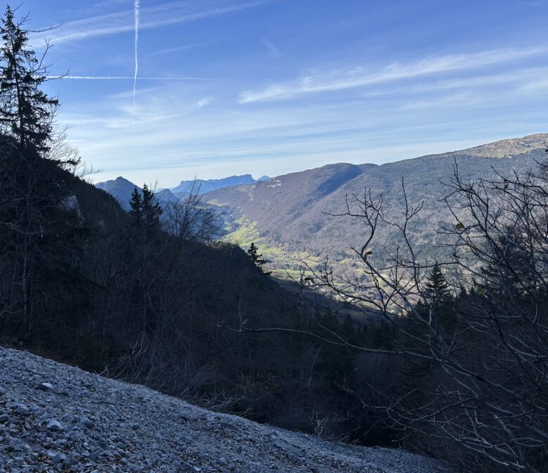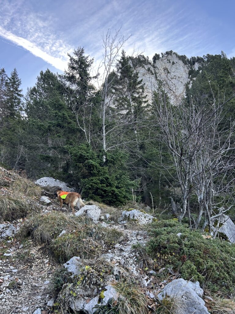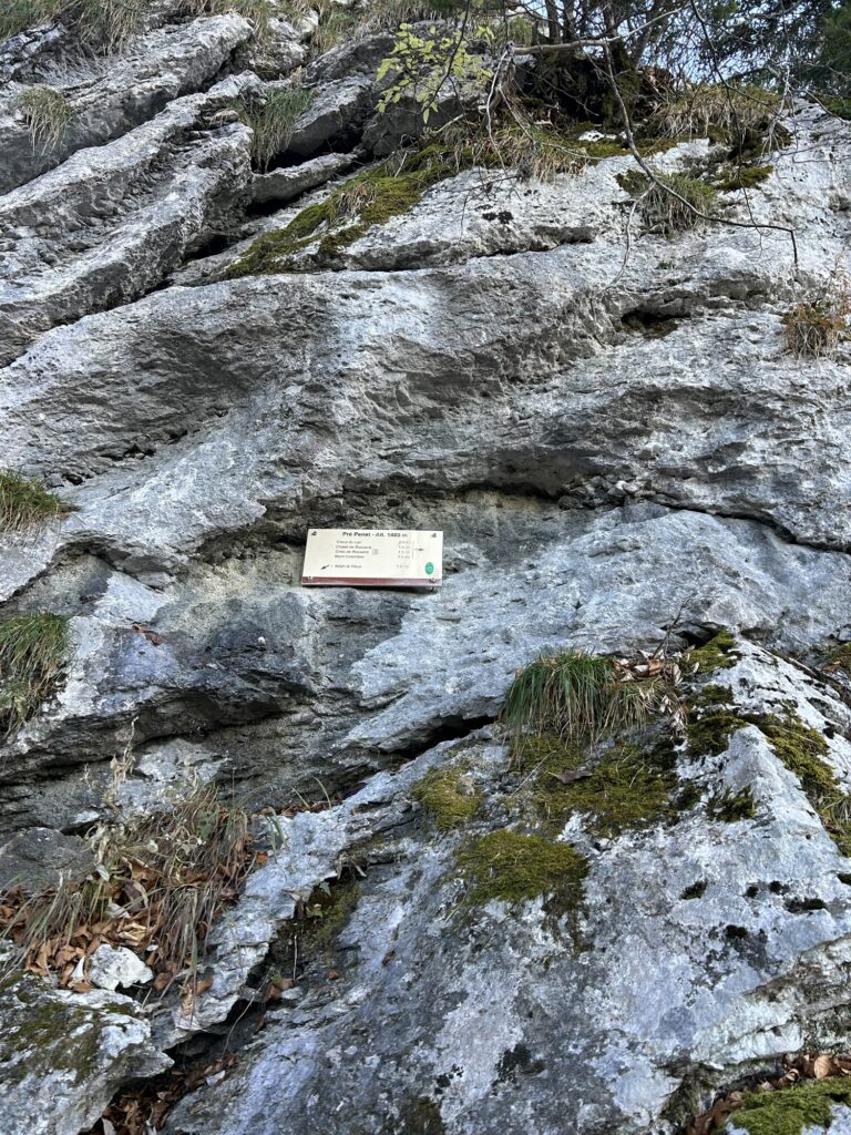 Ici commence donc une longue montée dans la forêt. Parfois très raide et notamment de la Combe du Cheval, on traverse quelques pierriers avant d’arriver enfin sur un premier col. Il s’agit du croisement avec l’itinéraire pour le Mont Colombier – qui se dresse majestueusement face à nous – qui part à droite tandis que nous poursuivons notre route à gauche.