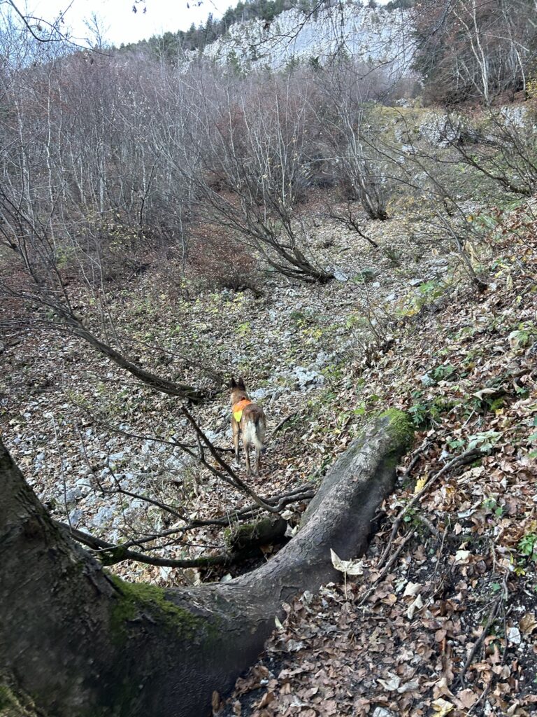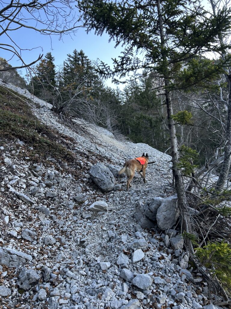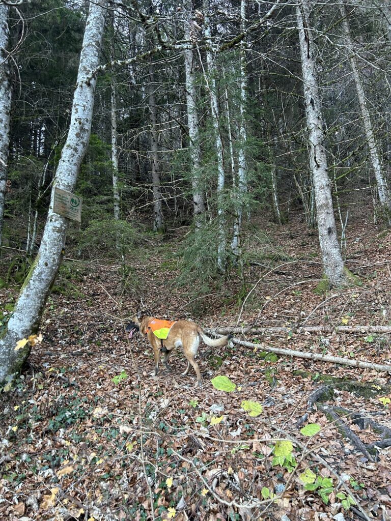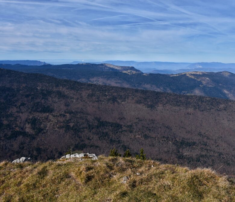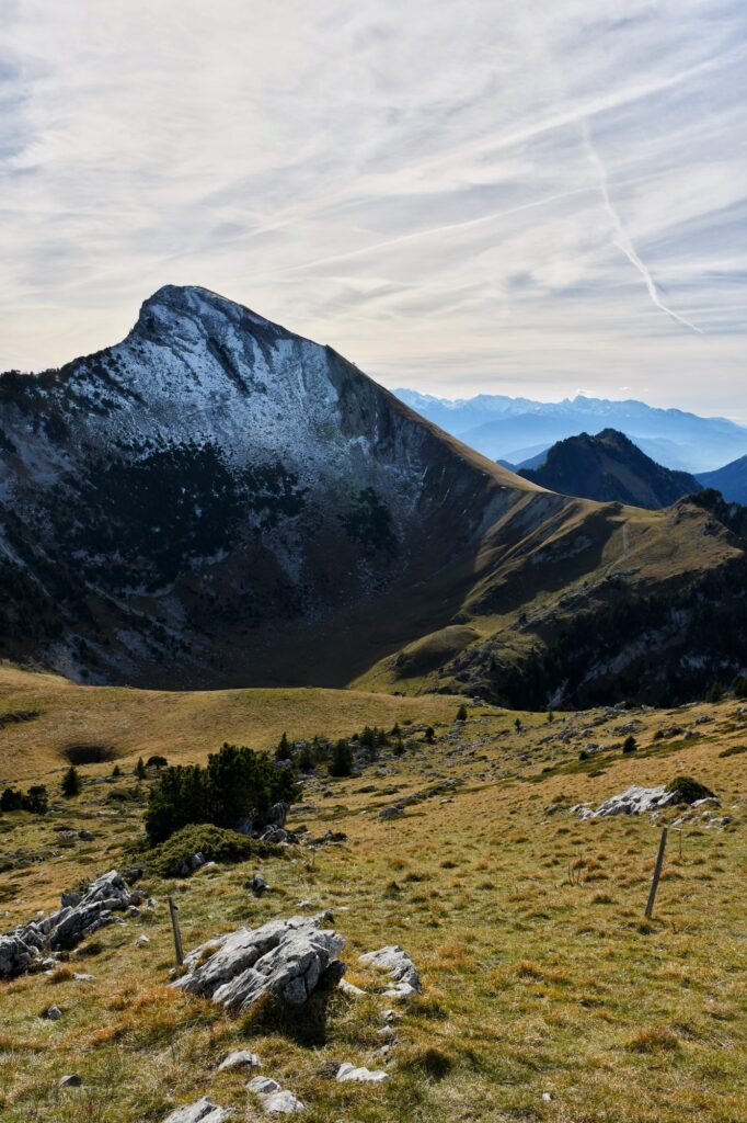 Ici commence donc une longue montée dans la forêt. Parfois très raide et notamment de la Combe du Cheval, on traverse quelques pierriers avant d’arriver enfin sur un premier col. Il s’agit du croisement avec l’itinéraire pour le Mont Colombier – qui se dresse majestueusement face à nous – qui part à droite tandis que nous poursuivons notre route à gauche.