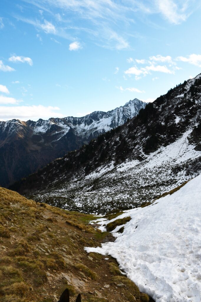 Deux options s’offrent à vous ici en fonction des conditions : sans neige, vous pouvez prendre juste en dessous de la cabane un sentier discret qui va longer à flanc tout le long de la montagne. Avec la neige, on vous conseille de prendre notre sentier de retour, c’est à dire remonter jusqu’en haut du télésiège de Claran pour prendre le chemin des Crêtes qui sera moins dangereux car plus large.