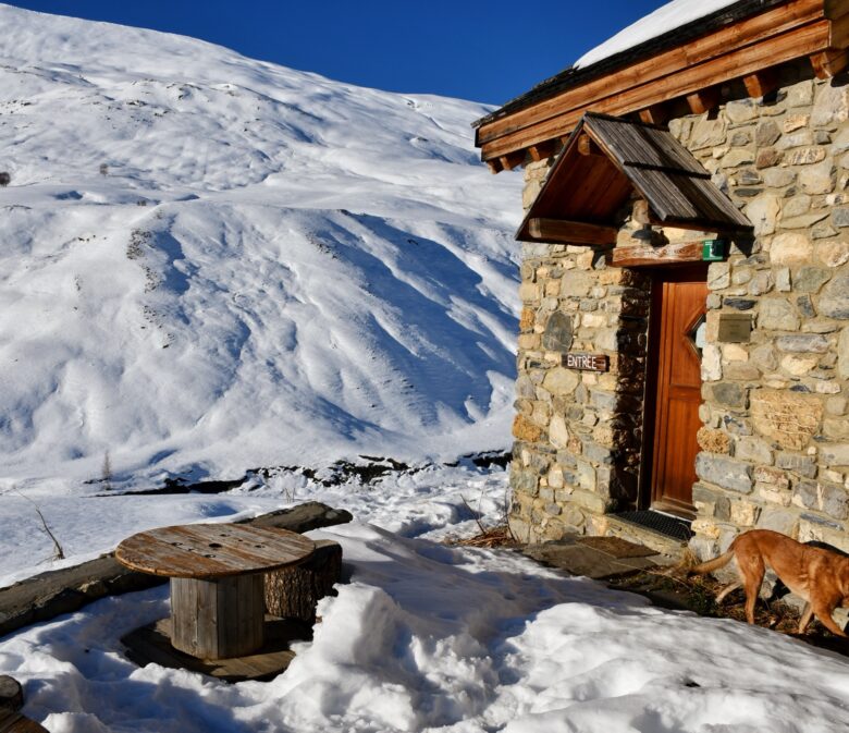 Ce dernier est constitué de deux blocs : le bâtiment principal constitue le refuge gardé lorsque ce dernier est ouvert et le petit chalet à proximité immédiate le local d’hiver non gardé en dehors des dates d’ouverture du refuge. Avec un chien, il faut privilégier les dates de fermeture du refuge gardé pour bénéficier du local d’hiver. Ils sont acceptés dans le refuge gardé en période d’ouverture uniquement s’ils sont calmes, n’aboient pas et ne peuvent pas dormir dans les dortoirs avec vous : une place leur est réservé dans l’entrée dans un panier.